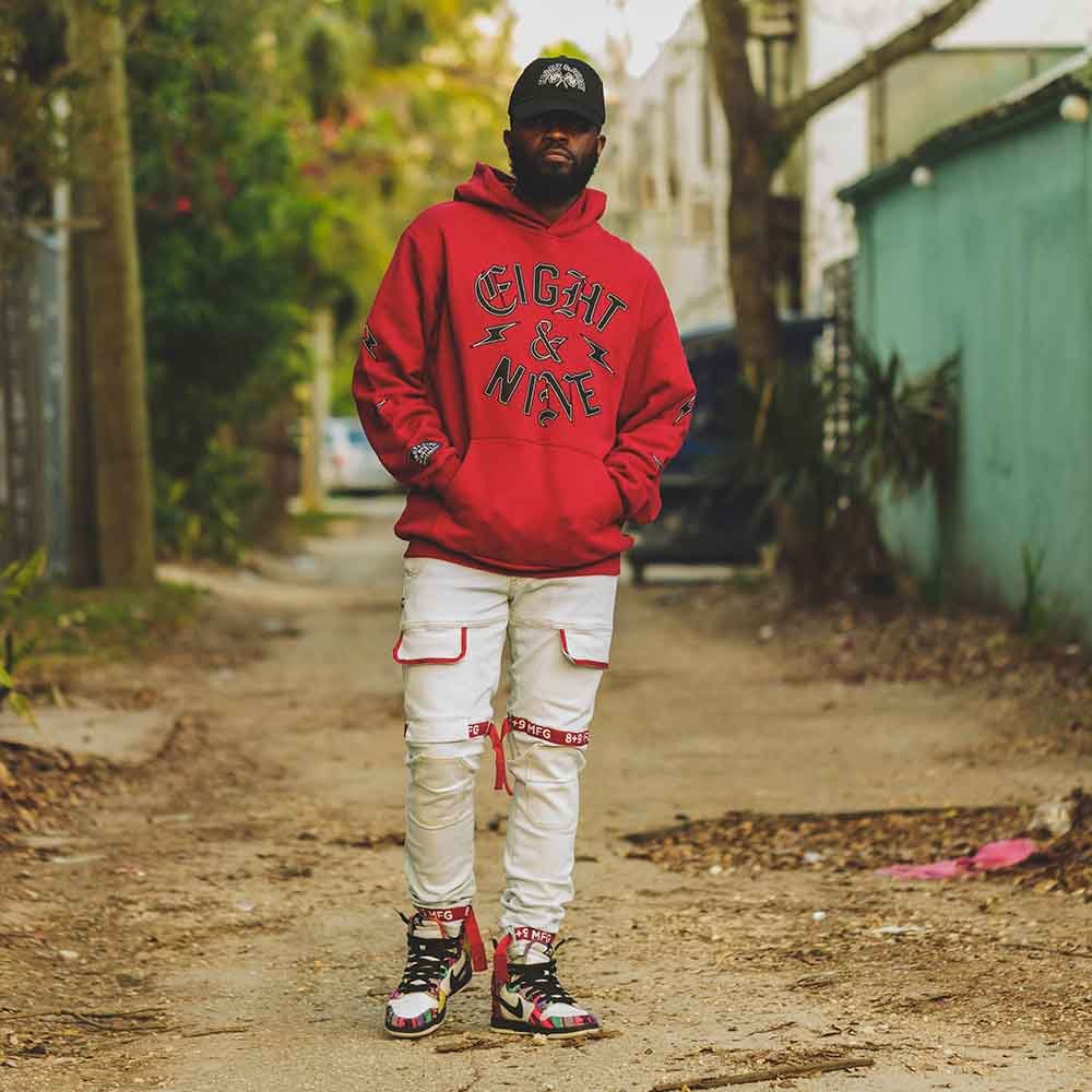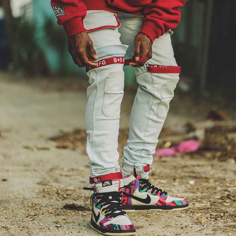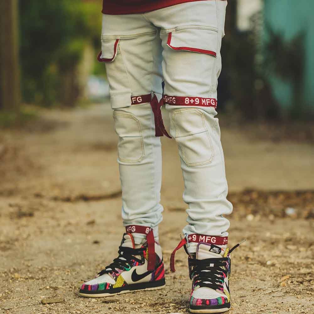 Premium light washed denim, subtle wash, faded look, maroon straps, white accent embroidery. Inspired by the early 2000’s these Strapped Up Utility Jeans get the job done. Modern fit, room up top slimmer below the knee, straps for custom fit. Classic men’s jeans with front cargo pockets, velcro straps with 8&9 MFG embroidery. Model is wearing 34.