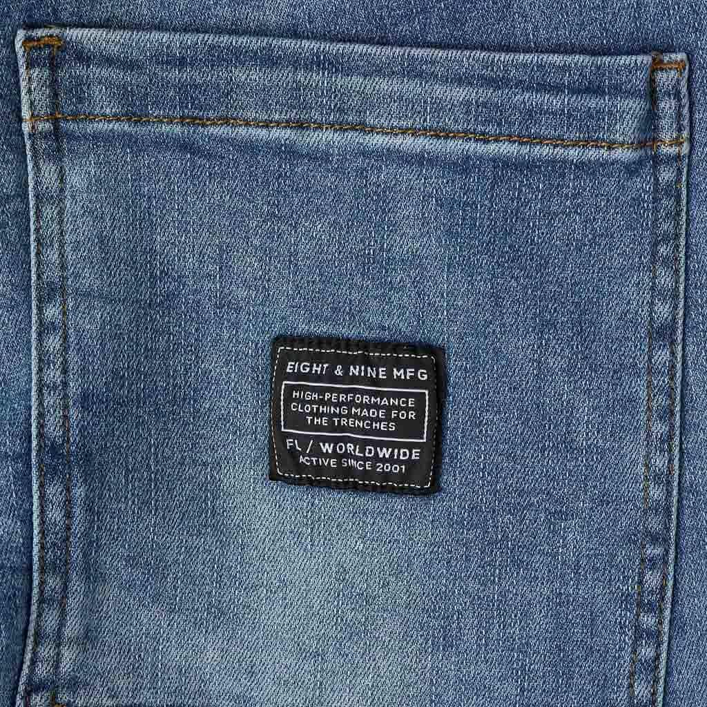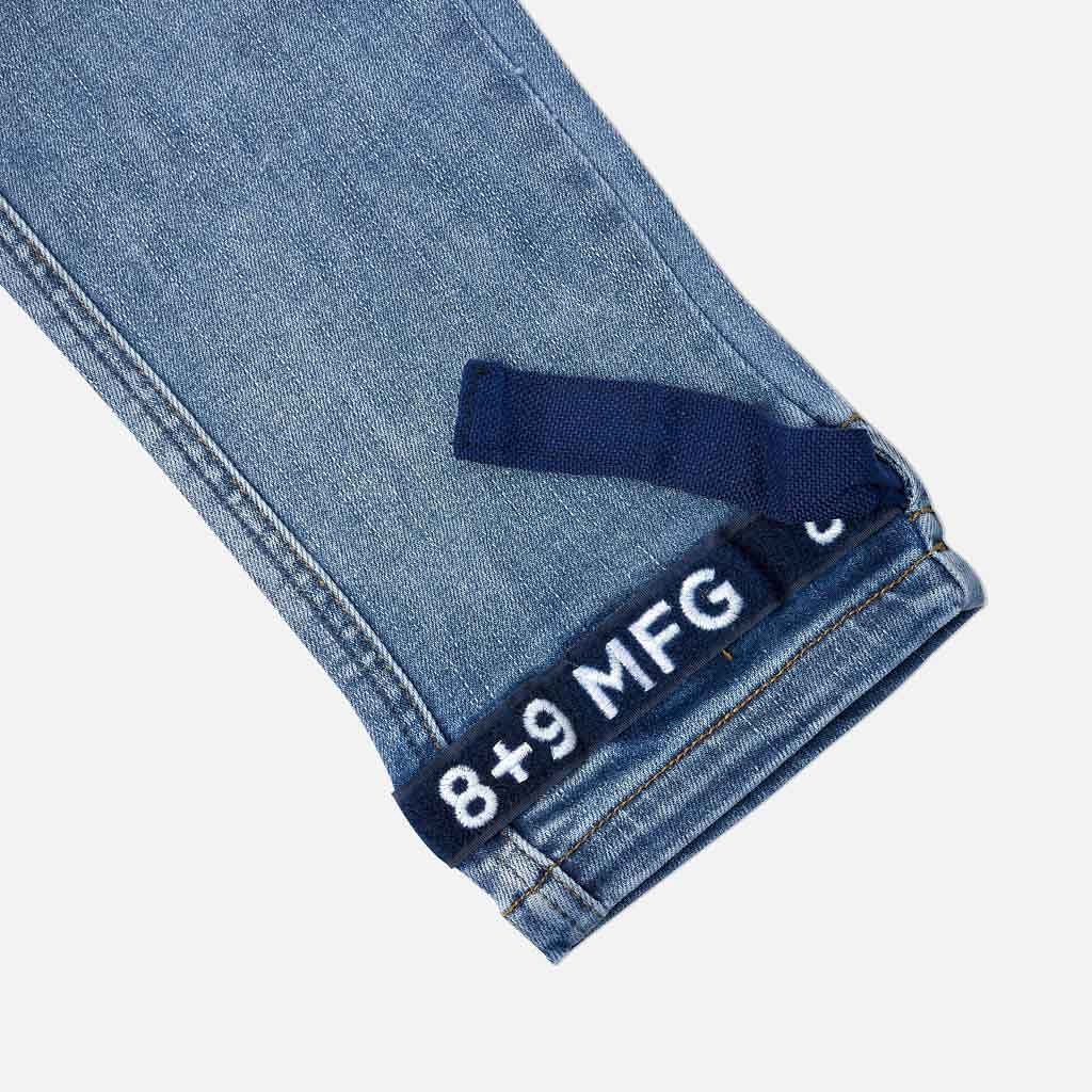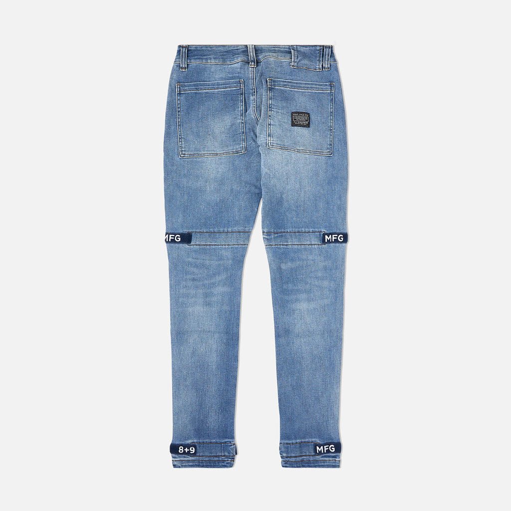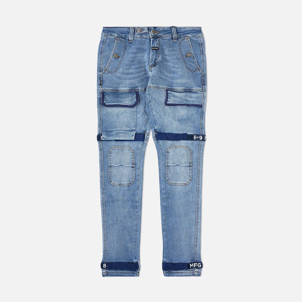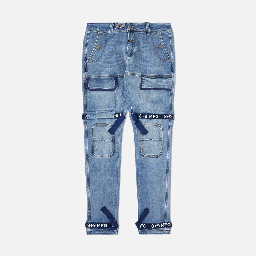 Premium medium washed denim, subtle wash, faded look, Navy straps, white accent embroidery. Inspired by the early 2000’s these Strapped Up Utility Jeans get the job done. Modern fit, room up top slimmer below the knee, straps for custom fit. Classic men’s jeans with front cargo pockets, velcro straps with 8&9 MFG embroidery. Model is wearing 34.