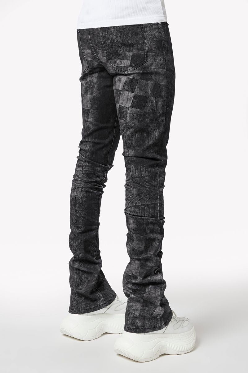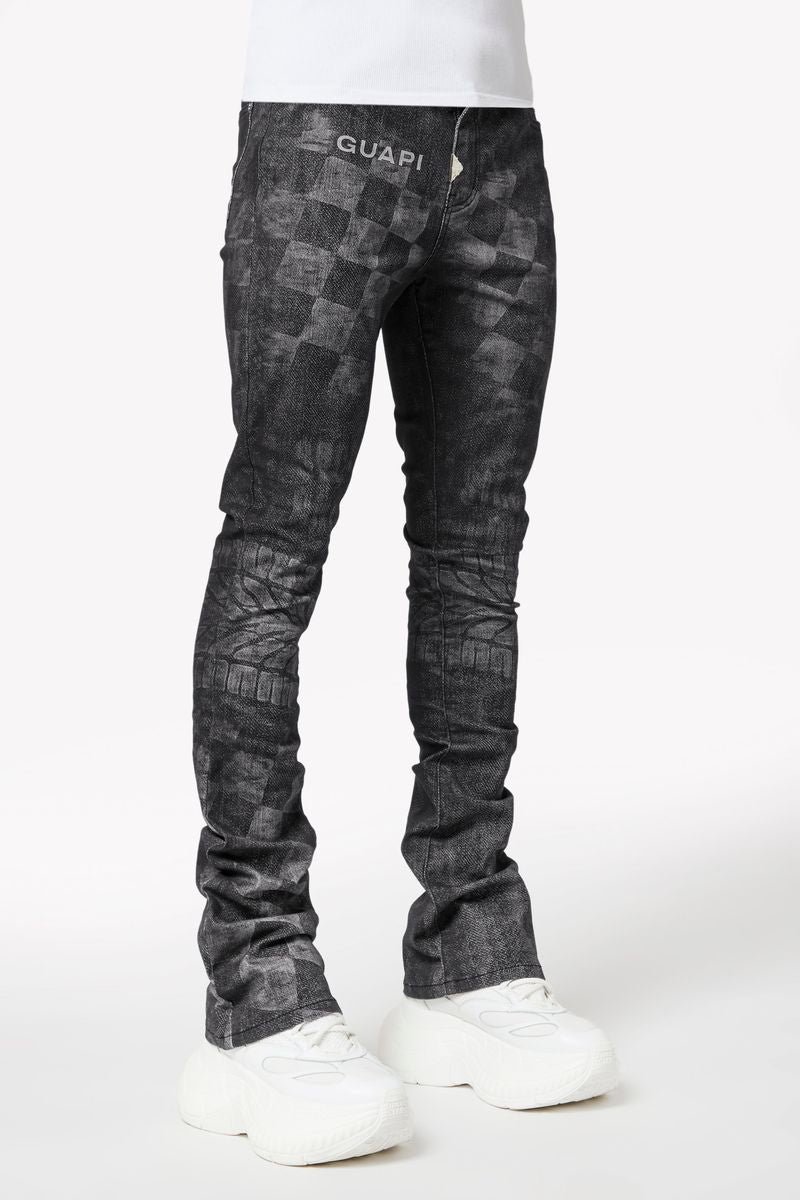 The Obsidian Black Racer Denim V1 brings a clean yet powerful racing-inspired aesthetic to GUAPI’s denim lineup. Crafted in a deep obsidian black wash, the jeans feature a subtle checkered flag motif across the body, paired with tire-track printed details along the knees and calves for a rugged motorsport edge.A minimal GUAPI logo is placed at the front waistline, keeping the branding sleek and understated. Built in premium stretch denim, the jeans are designed in a slim stacked fit with an elongated inseam, ensuring natural stacking over sneakers and a sharp silhouette. Reinforced with branded hardware and signature rivets, the V1 offers durability while maintaining GUAPI’s luxury streetwear identity.Premium stretch denim in obsidian black washTonal checkered flag pattern integrated across the bodyTire-track printed detailing on knees and calvesMinimal GUAPI logo on the front waistlineSlim stacked fit with elongated inseam for natural stackingRugged construction with branded hardware and signature rivetsClean back profile for a refined, understated finish.