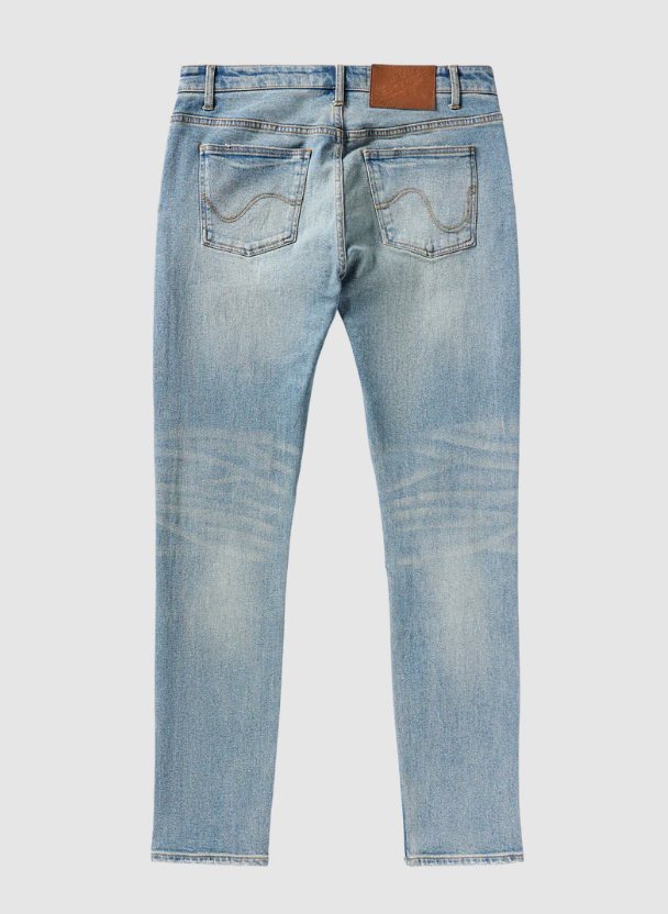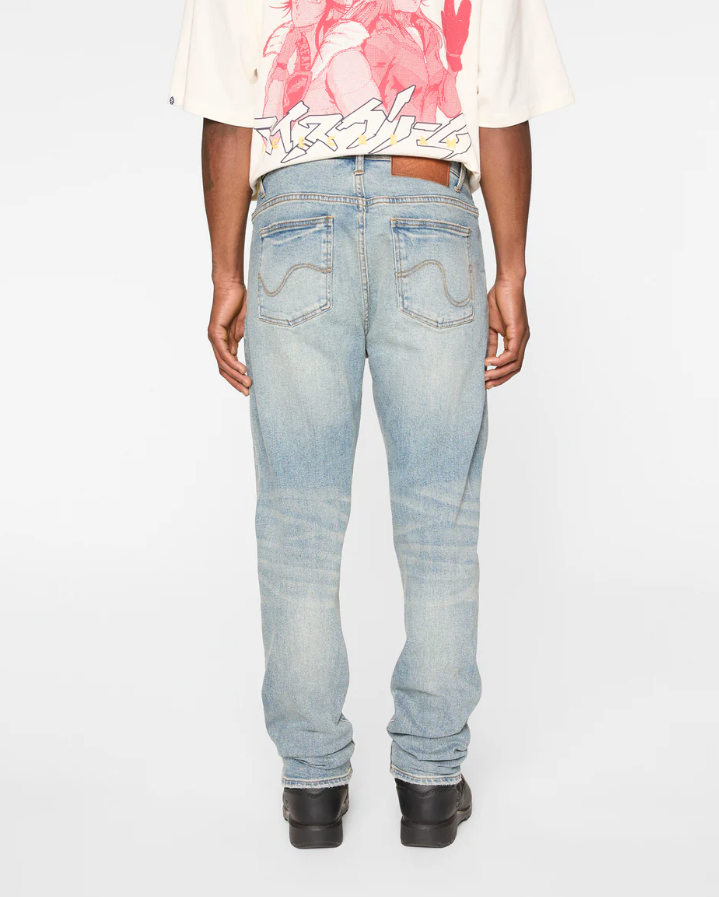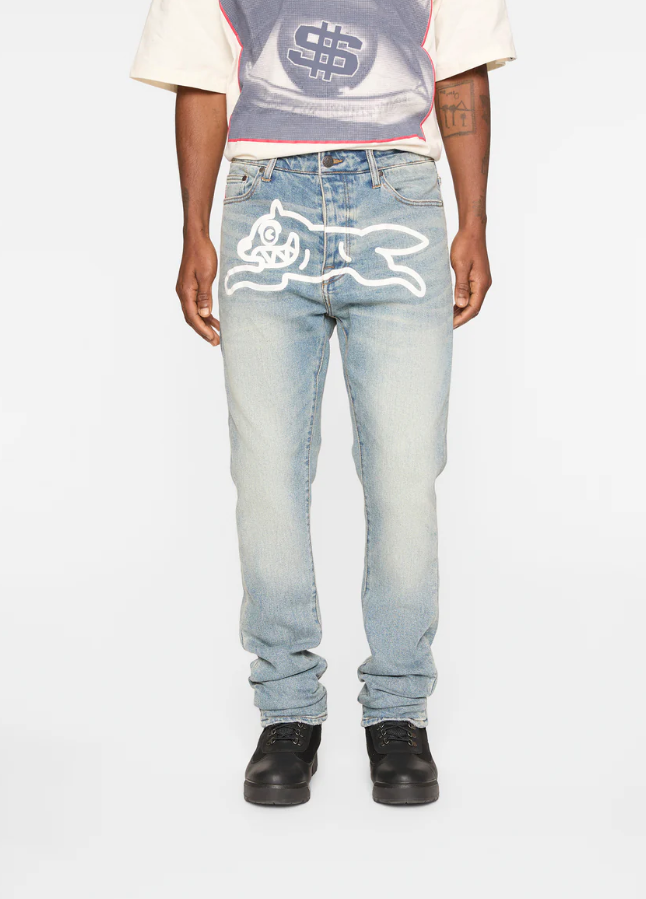 The Blue Cheese Jeans feature the Running Dog logo printed on the front crotch, along with drip stitching on the back pockets.