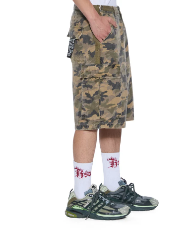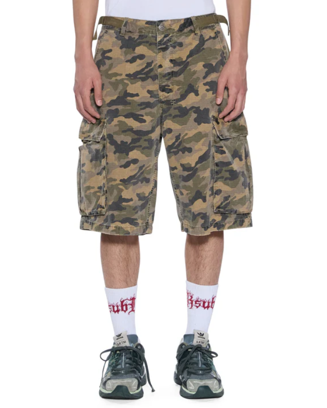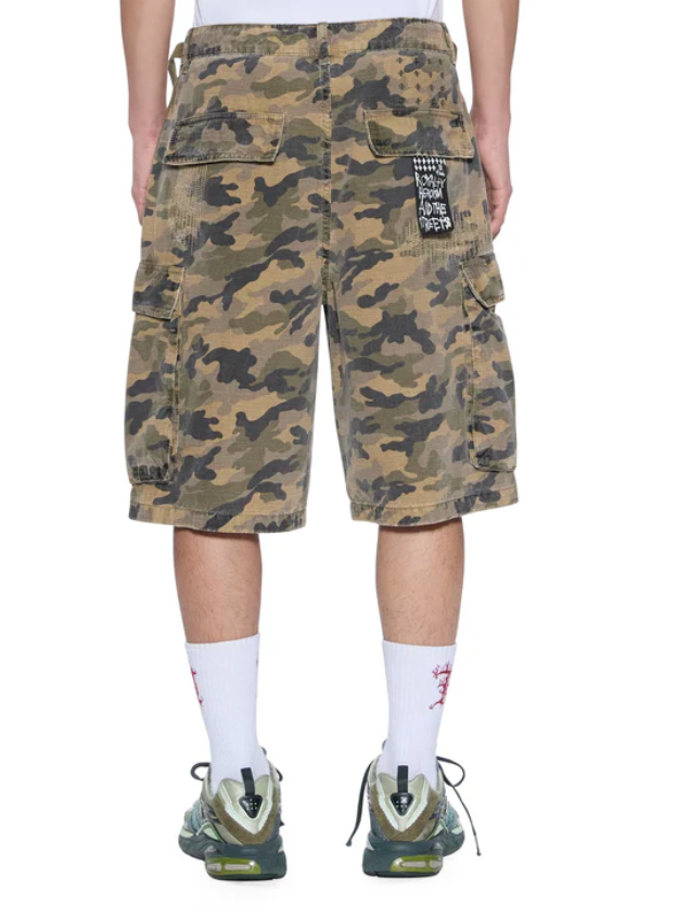The Troop Cargo Short Camo is a relaxed-leg cargo short featuring side bellowing cargo pockets, regular side-entry pockets, and back flap pockets. Made from classic cotton rip-stop camouflage with a faded wash, it includes gros-grain puller tabs on the waist and internal waistband, side-seam detailing, and is finished with signature T-box and 4×4 embroidery branding and Ksubi hardware.