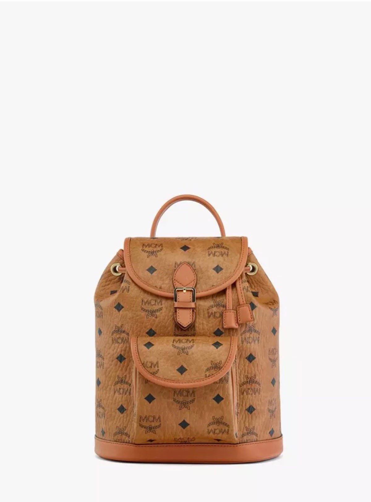 Introducing the MCM Backpack – Mini Aren VI Drawstring in Cognac, the perfect accessory for any style-conscious individual on-the-go. Measuring approximately 4.3 x 8.5 x 10.2 inches, this lightweight backpack is designed to keep all your essentials organized, no matter where your adventures take you. Crafted from high-quality materials, including Spanish calf leather trim and the iconic Visetos monogram canvas, this backpack exudes luxury from every angle. The 24k gold-plated metal hardware adds a touch of opulence, while the microfiber lining with suede finish provides a soft and durable interior for your belongings.