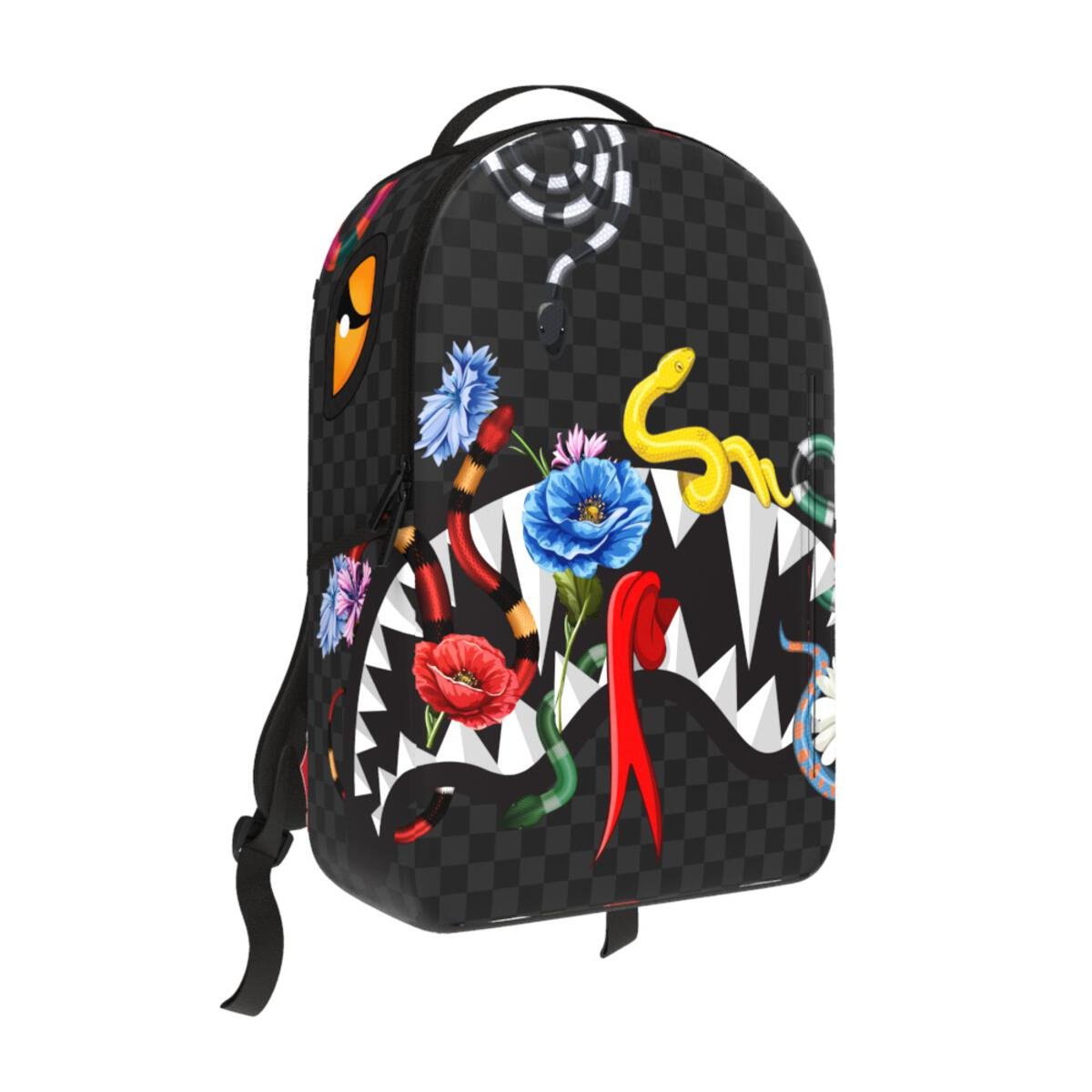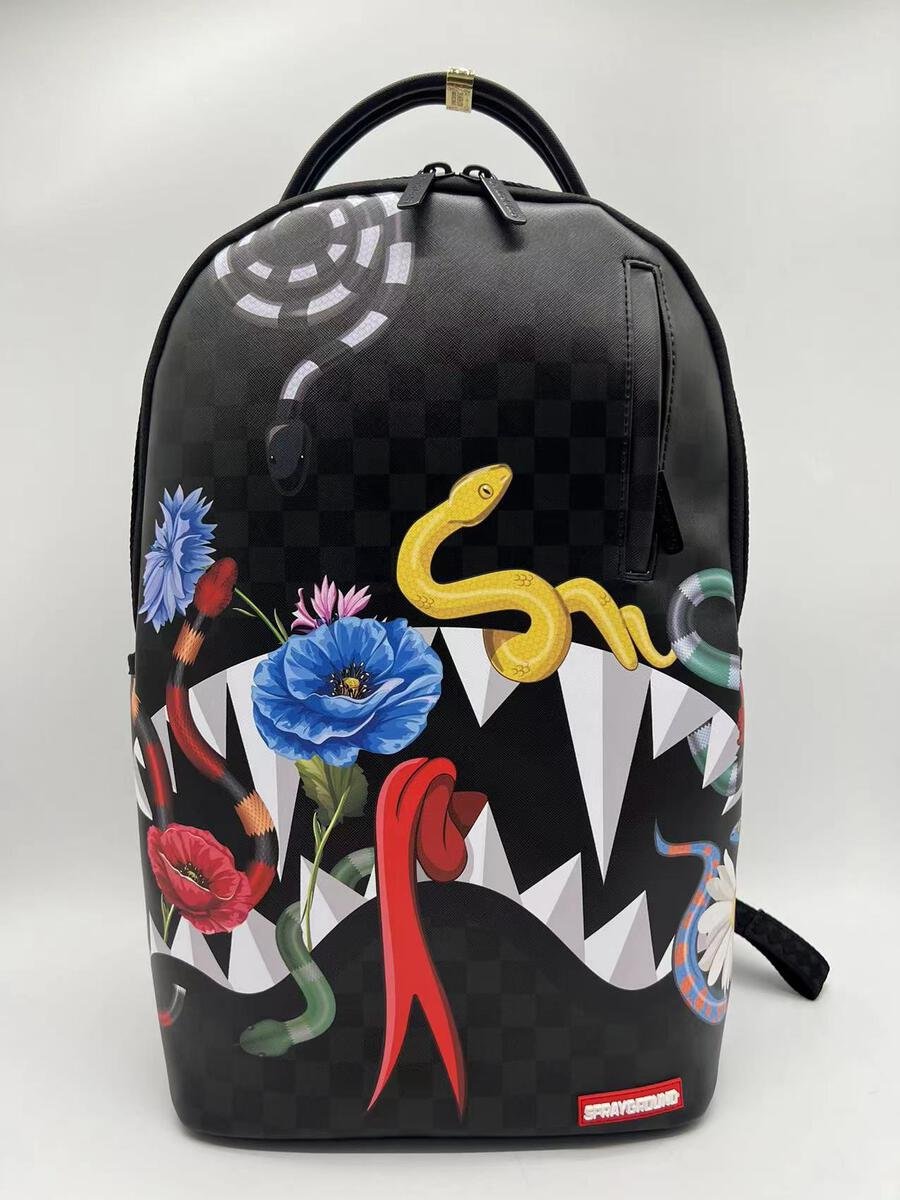 The Sprayground Backpack – Snakes on Bag in Black is a stylish and functional backpack with a snakeskin design, featuring multiple pockets, a separate sunglass compartment, and ergonomic padding for comfort. Made of durable water-resistant faux leather, with gold zippers, metal hardware, and a convenient slide-through back sleeve for easy travel.