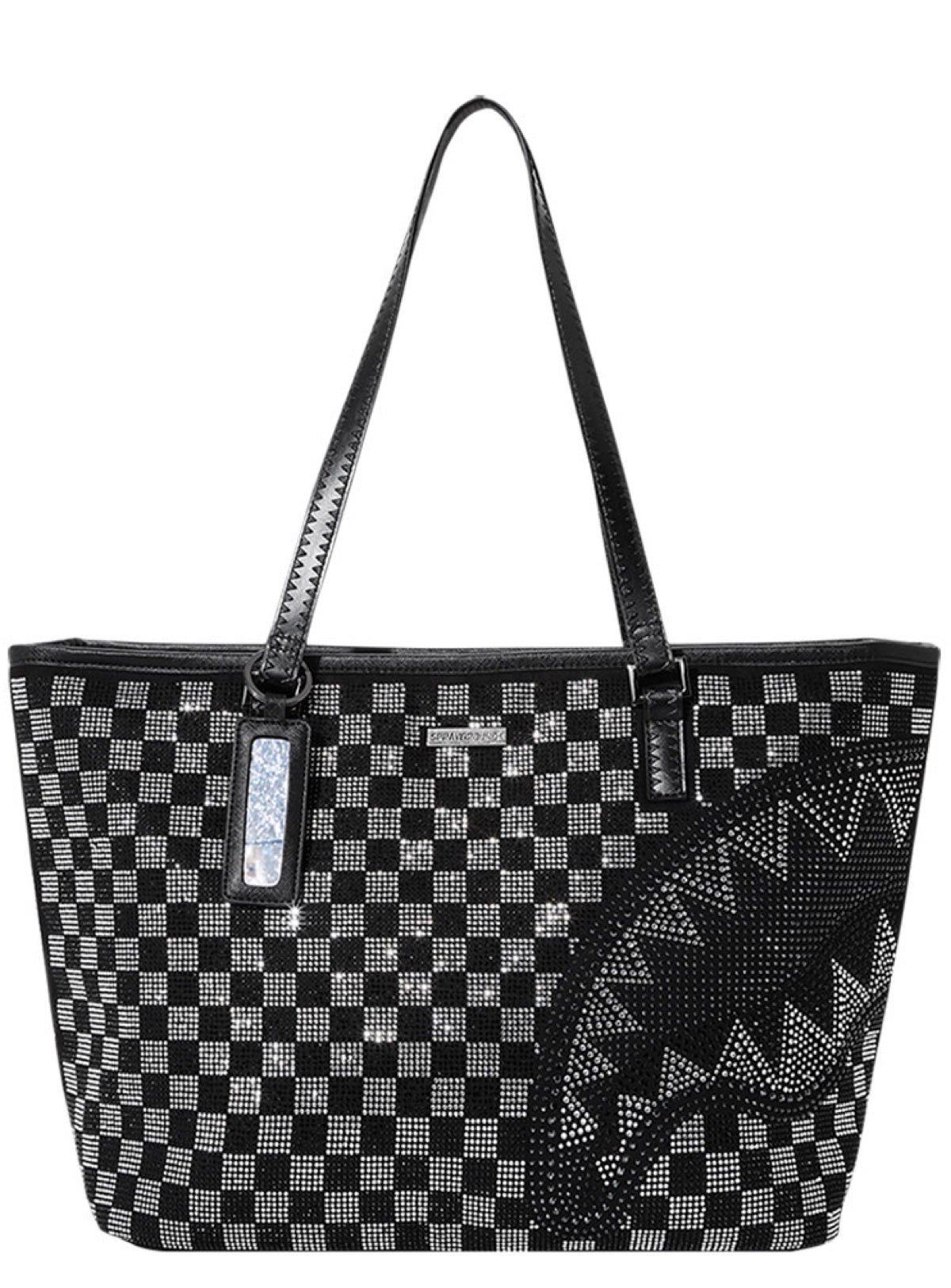 This Sprayground Bag is a must-have for any fashionista. It features a unique checkered design with a crystal embellishment, giving it a luxurious look. Crafted from 100% FAUX leather, it is water-resistant, making it perfect for everyday use. It has a top zipper opening, top double handle, Sprayground keychain, and gold zippers with metal hardware. The interior comes with a cotton printed lining and a zippered organizer pocket. Make a statement with this stylish and practical bag!