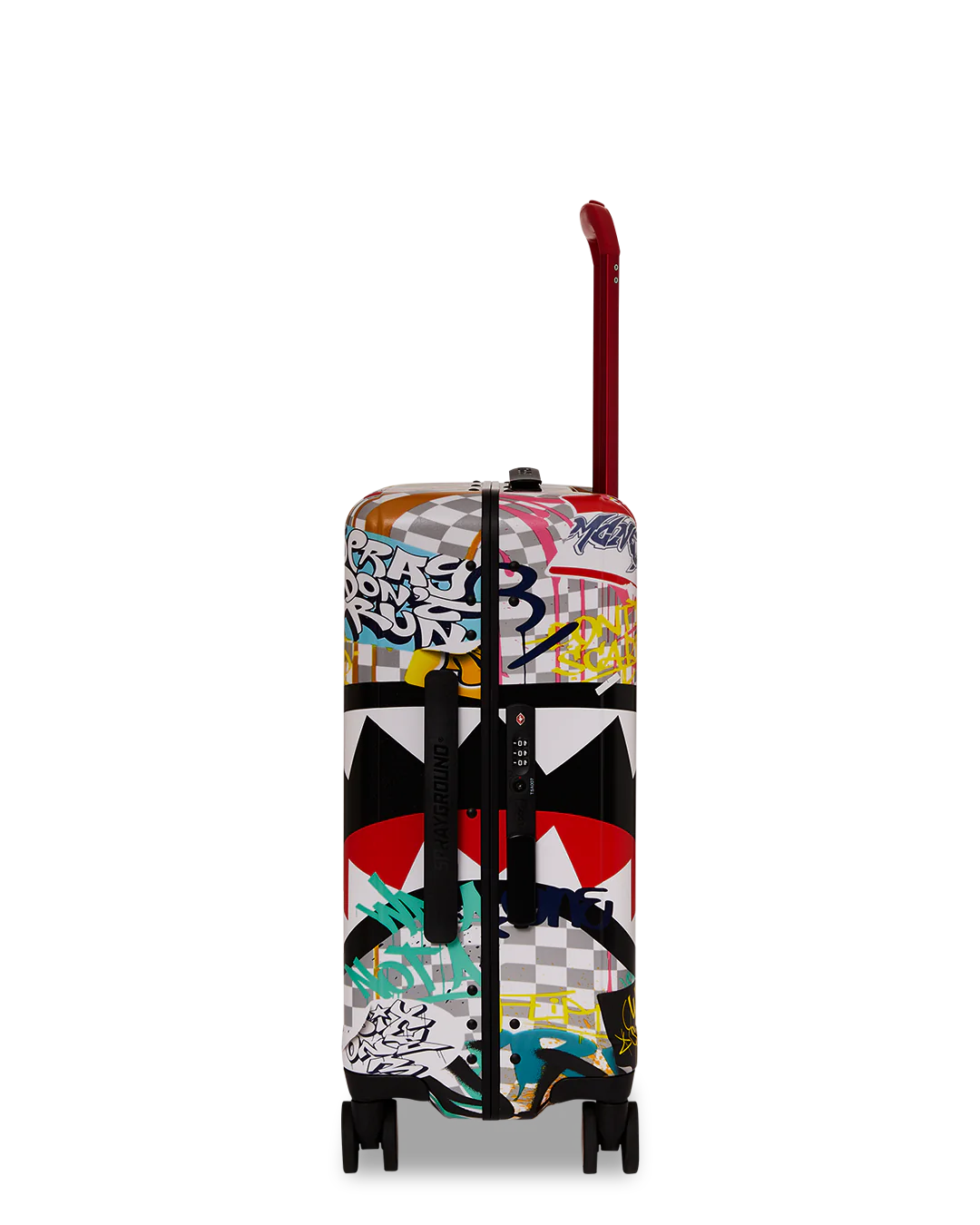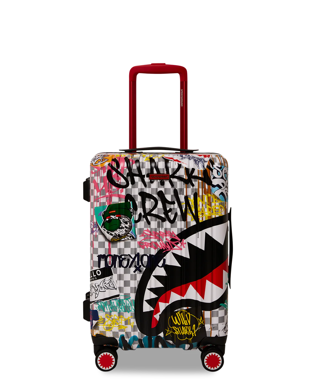 PATENTED SHARK SCULPTURE No. D852504, D854321 Strong and Indestructible 100 % Polycarbonate Shell TSA Approved Dimensions w/ Wheels: H: 21.5” x W: 13.74“ x D: 8.66” *TSA Security Locks Zipperless Aluminum Alloy Frame 4 Dual Spinning Recessed Wheels Telescope Adjustable Handle INTERIOR: Multiple Pockets and Compartments for Maximum Organization Money Print Satin Lining Mesh organizer pockets Fastening Straps Nylon Zippers with Metal Hardware